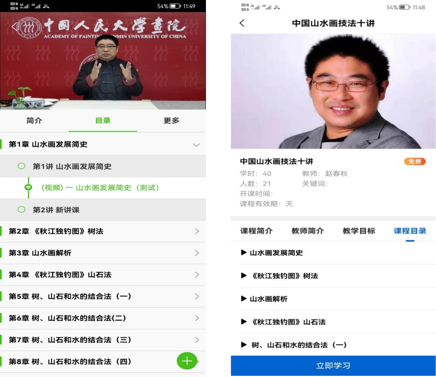 5278论坛 画院2021年中国书画在线教育课程研修班是5278论坛 画院秉承“充分发扬国学、国艺”的宗旨,依托5278论坛 雄厚的教育资源和人文社科资源优势,依托“学在人大”终身学习平台强大的多场景多模式多终端功能优势,创新开设的中国画线上培训,课程内容涵盖中国人物画、山水画、花鸟画、书法四大部分,第一期共推出十门课程,每门课程40个课时,平均每周2次课,每次课程2课时。课程学习采用“点播+点评”翻转式教学模式和渐进式教学安排,学员可以灵活安排学习时间,系统学习书画技能,在老师及教学团队的带领下完成课程及有关画作练习和提高,大大提高了学员学习的能动性和教师教学的针对性。为确保首期线上培训顺利开展,保证课程和教学质量,画院组织了优秀的授课教师及教学团队,聘请了专业的书画视频课件制作机构,目前已完成300多课时的拍摄和制作。